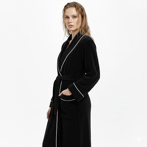 Der Liora Bademantel sorgt für wohlige Wärme, beugt unangenehmem Frieren vor und begleitet dich zuverlässig durch entspannte Wohlfühlmomente zu Hause.